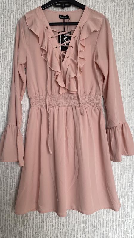 Красива міні-сукня, підкреслює талію, на довгий рукав. Бренд: Boohoo Розмір: uk10 Склад тканини: 100% поліестр Параметри: В плечах 37 см В грудях 44 см Талія 33-38 см Довжина 87 см Довжина рукава 3/4