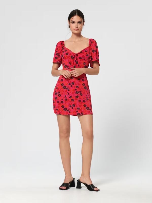 Чудова міні сукня на літо , дійсно дуже яскрава та приємна на дотик . 1.довжина міні 2.декоративний вузол 3.короткі рукави 4.квітковий візерунок 5.декоративні зборки Я отримала її та сандалі сьогодні - я занадто худюща для неї, хоча й це розмір ХС. Має бути дама з гарним бюстом, хоча б від 2 розміру, інакше сидіти не буде , це причина чому я її одразу й продаю!))