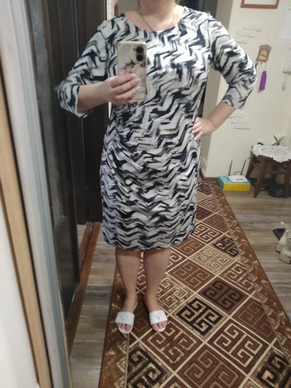 Легке, приємне до тіла плаття прямого сілуету. Довжина 100, по грудях 55, по стегнах 60. Матеріал добре тягнеться, попереду вертикально іде збірка, добре ховає животик.
