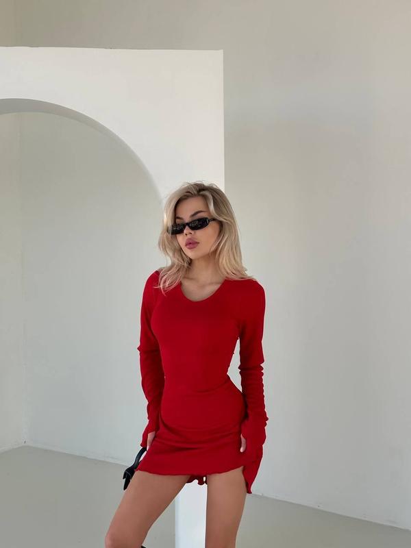 Платье корсет в рубчик с завязками на спине с длинными рукавами с разрезом для пальца хоро...