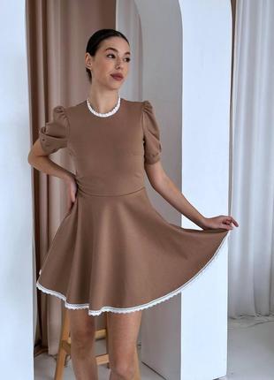 Тканина: трикотаж Колір: бежевий Розмір: L Опис: жіночна сукня із італійського трикотажу с спідницею у формі сонця. Тканина стрейчева і гарно сідає по фігурі. Окантовка на спідниці і горловині виконана із бавовняного мережева. Застібається сукня на блискавку на спині, що дозволяє легко одягати і знімати її. Модель 253