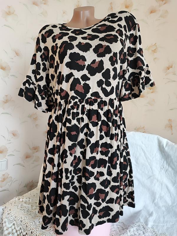 Шикарное брендовое платье-туника в леопардовый принт. Небольшой круглый вырез. Отлично садится по фигуре, свободного кроя. Длина по спинке 80 см. В бедрах 75 см. Смотрится очень эффектно и стильно. В плечах 42 см. Короткий расклешенный рукав с рюшей. Длина рукава от плеча 24 см. Состояние идеальное. Дефектов нет.