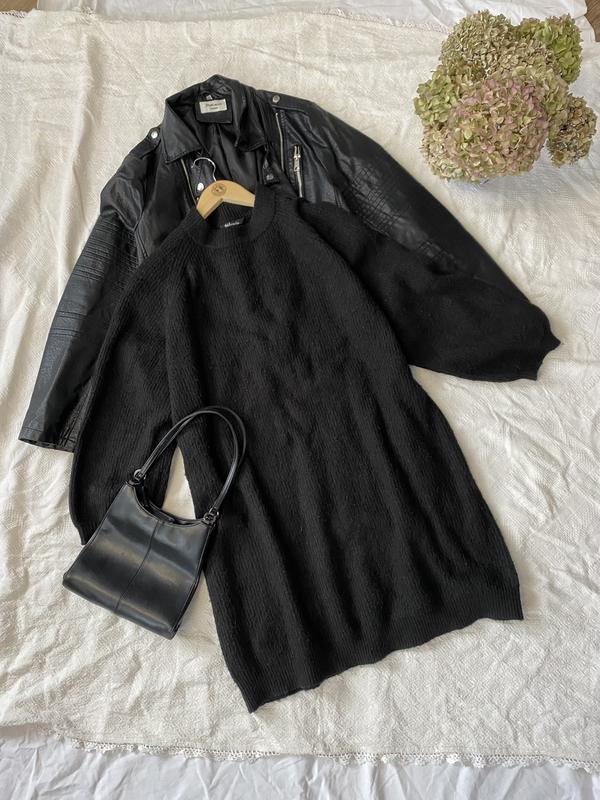 Плаття розмір XL, краще L, у складі акрил, поліестер та 10% шерсті, середньої щільності, прямого крою з обʼємними рукавами, довжина 89см., півобхват грудей 64см., довжина рукава від горловини 69см. Стан ідеальний.