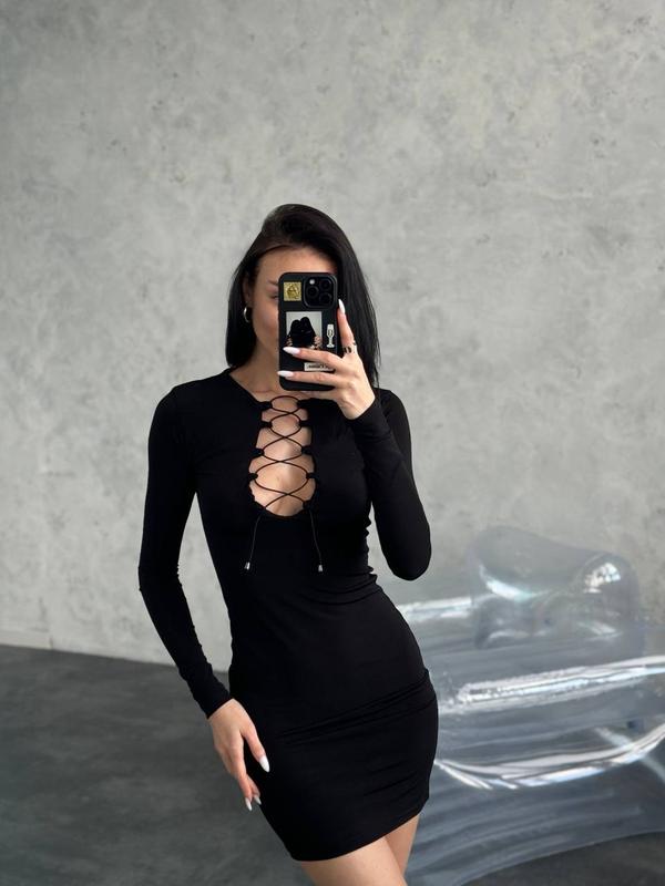 ‼️Облягаюча коротка сукня з глибоким декольте на шнурівкі 🟠🟠🔴🟠 ▪️модель: 103 ▪️тканина: мікродайвінг ( дуже добре тягнеться , виробник- Туреччина ) ▪️кольори: чорний ▪️розміри: S / M (42-44) L / XL (46-48) ▪️480 грн Неймовірна спокуслива та стильна облягаюча сукня в класичному чорному кольорі, призначена для справжніх модниць Шнурівка на декольте регулює його довжину та виріз Тканина - не мнеться, не витягується, приємна до тіла Довжина -92 см ОТ : S / M - (60-70)см L /ХL - ( 71-84) см ОГ : S / M - до 88 см L/XL - (88-96) см ОС: S/M - (86-98)см L/XL - ( 99-106) см