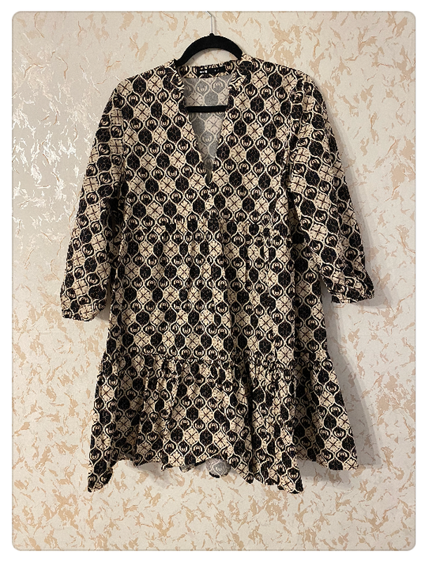 Женское платье в принт. На бирке размер Л, может подойти на М. На фото одета ростом 168. Легкая и приятная к телу. Рукав-фонарик на резинке. Не просвечивается.