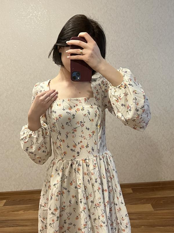 Сукня на зріст 166 см трохи вища колін Має два розрізи по бокам Обʼємні рукава на ризинці