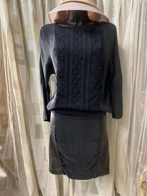Стильна маленька чорна сукня від 8 PM. Колір чорний. Верхня частина сукні -cupeo(100/), нижня частина сукні(еко-шкіра чорного кольору). Розмір по бірці-S. Заміри:довжина-94 см, ПОГ-46 см, ПОБ-42 см.