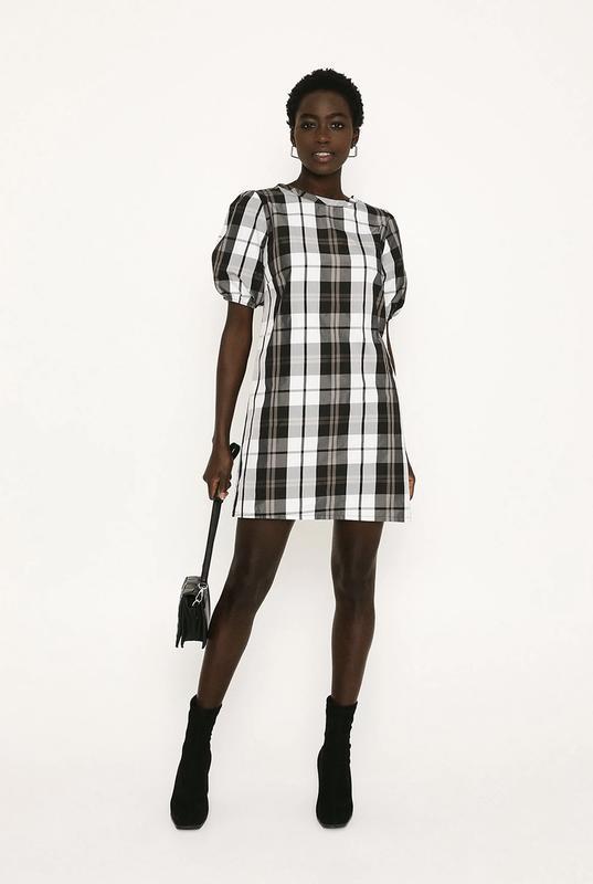 Сукня поліестерова в клітинку з рукавами-ліхтариками. Тканина щільна структурна за типом плащової. Розмір 10. Довжина 80 см, ПОГ 48 см, ПОБІДИ 52 см, плечі 34 см, рукав-29 см