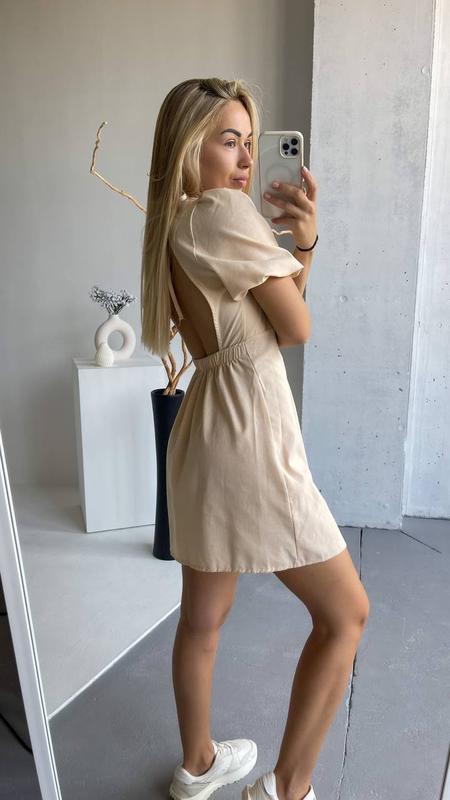 Сукня арт.0487 Ціна: 720 грн Колір: кремовий, малина Тканина: льон Розмір: 40(хс), 42(с) Фото в живу. Зріст 160 см Сукня міні з відкритою спинкою. Рукавчики на резинці. Тканина приємна до тіла. Заміри 40(хс): Ог: до 80 см От: до 60 см Ос: до 84 см Довжина-78 см 42(с): Ог: до 90 см От: до 67 см Ос: до 90 см Довжина-78см аля