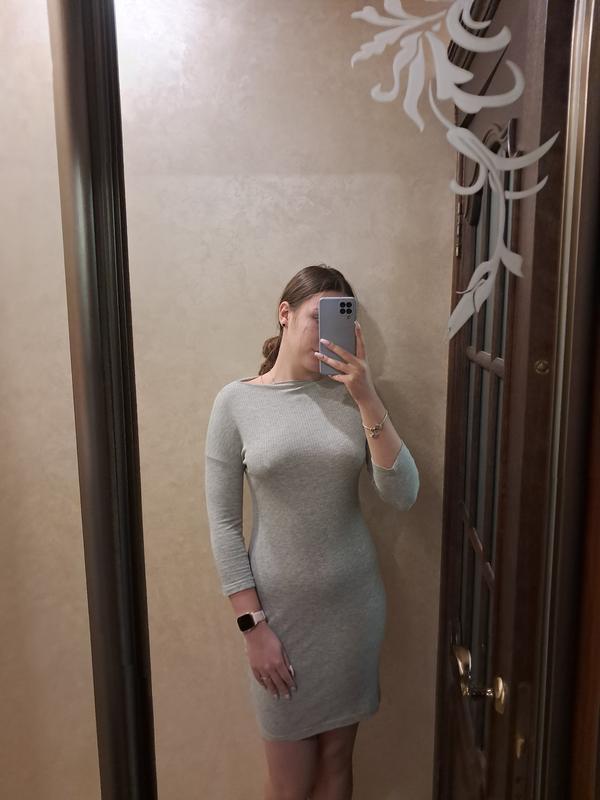 Жіноча міні-сукня сірого кольору. Тканина - рубчик. Рукав три чверті.