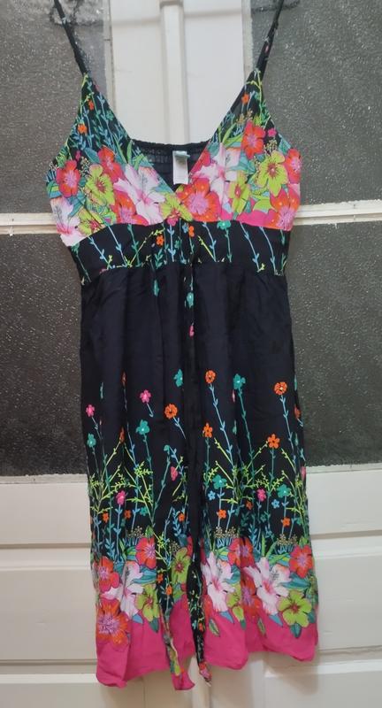 Красивий літній сарафан з віскози, на розмір М/46, під грудьми поясок( можна стягувати, як зручно).Висота по плечах регулюється за допомогою бретельок. Заміри: Пог- 45 см, тягнеться до 53 см( позаду на резинках), під грудьми напівохват -38 см( можна стягувати поясом) Пот- вільно, Поб- вільно, максимально - 67 см., довжина як на фото- 99 см.