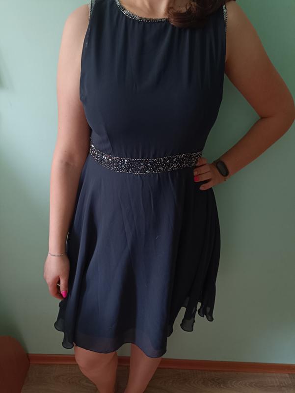 колір темно синій сзаду на блискавці оздоблена пайетками та бісером розмір 14 довжина від плеча 98см об'єм грудей 106 см об'єм під грудью 86 см бедра вільні