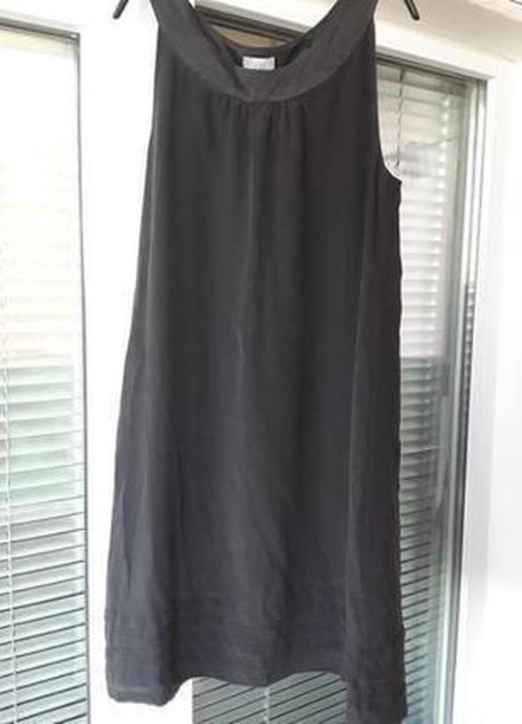 Сукня з натурального шовку, колір мокрий асфальт, на підкладці. Сукня А-силуету. Шовк щільний, зернистий, з матовим шовковим відливом. Без особливостей і дефектів. Довжина 88, пог 44, поб 52, ПО низу 59.