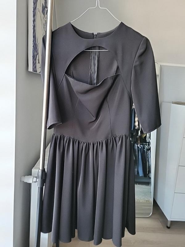 Дуже гарна сукня пошита на замовлення. Стан ідеальний. Гарний та стильний виріз на грудях, рукав до ліктя, спідниця-сонцекльош. Підійде на розмір xs-s, чашка розмір b.