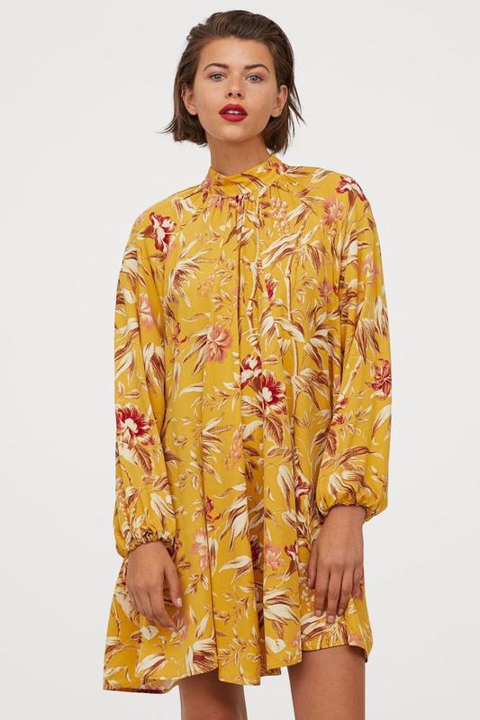 Коротке плаття з повітряної, м’якої драпірованої тканини з віскози. Зібраний комір-стійка та відрізок ззаду на ґудзиках. Довгі широкі рукави реглан і вузькі прикриті манжети на гумці. Без підкладки.