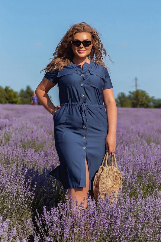 Сукня №515/0262 Ціна-1070грн розмір 42-44,46-48,50-52,54-56 тканина літній джинс Колір синій Літня джинсова сукня з кишенями застибається на гудзики.Затягується на поясі шнурком,по боках є розрізи