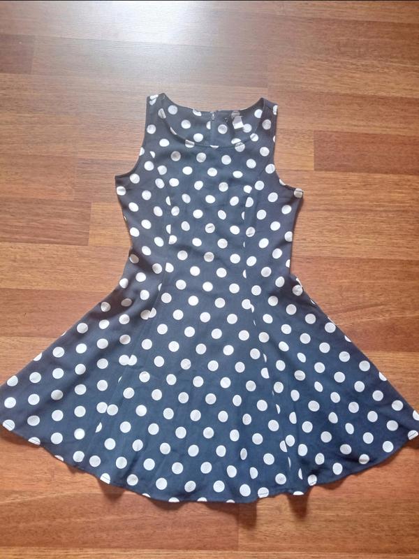 Синя сукня в білий горошок, h&m, 38 розмір. Дві міні затяжки в районі пояса на третьому фото