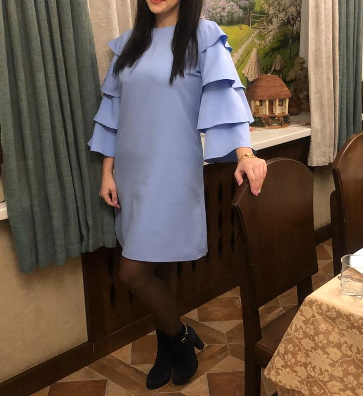 Платье трапеция нежного голубого цвета Размер 44 Ткань полиэстер Одетая 2 раза! Состояние новой Длина 90 см ПО груди 46 см Длина рукава 47 см