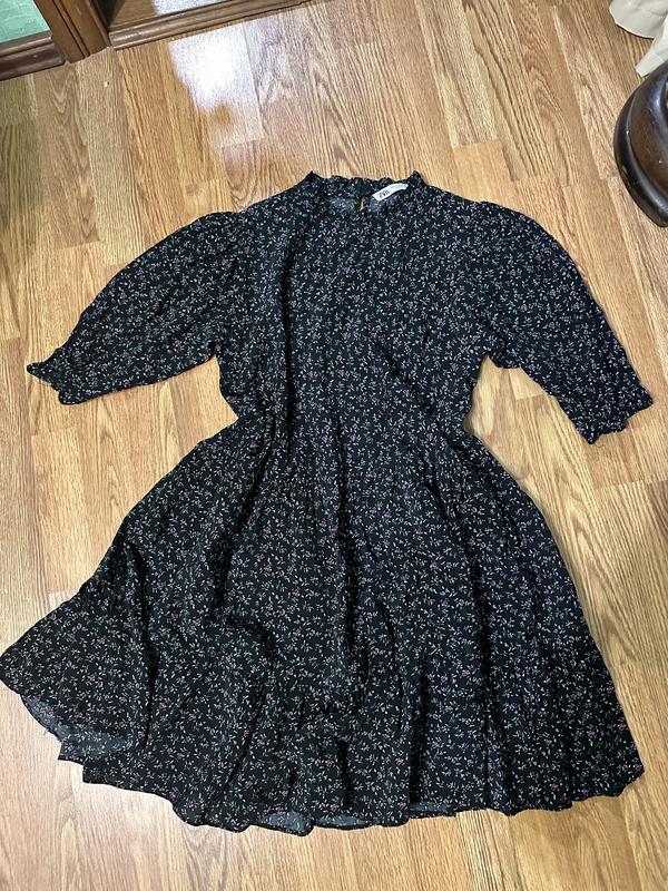Плаття жіноче Весна-літо ZARA Ззаду застібається на ґудзичку Колір — чорний у дрібні квіточки Дуже легка та приємна до тіла Розмір XS Заміри: Плечі 33 см Напівобхват грудей 45 см Напівобхват талії 50 см Напівобхват стегон 80 см Довжина 88 см