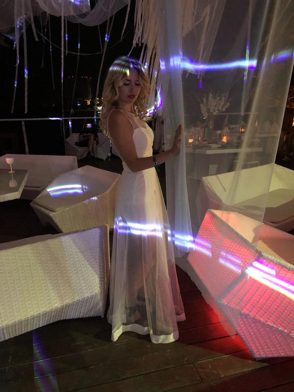 Біла гарна сукня, з відкритою спиною, в доброму стані, сітка ціла, замочок також, є ледь помітна пляма, виводити не пробувала. Мій зріст 170 см. Є вставні чашечки, без пушапу, груди не просвічуються. Підюбник вдягається окремо