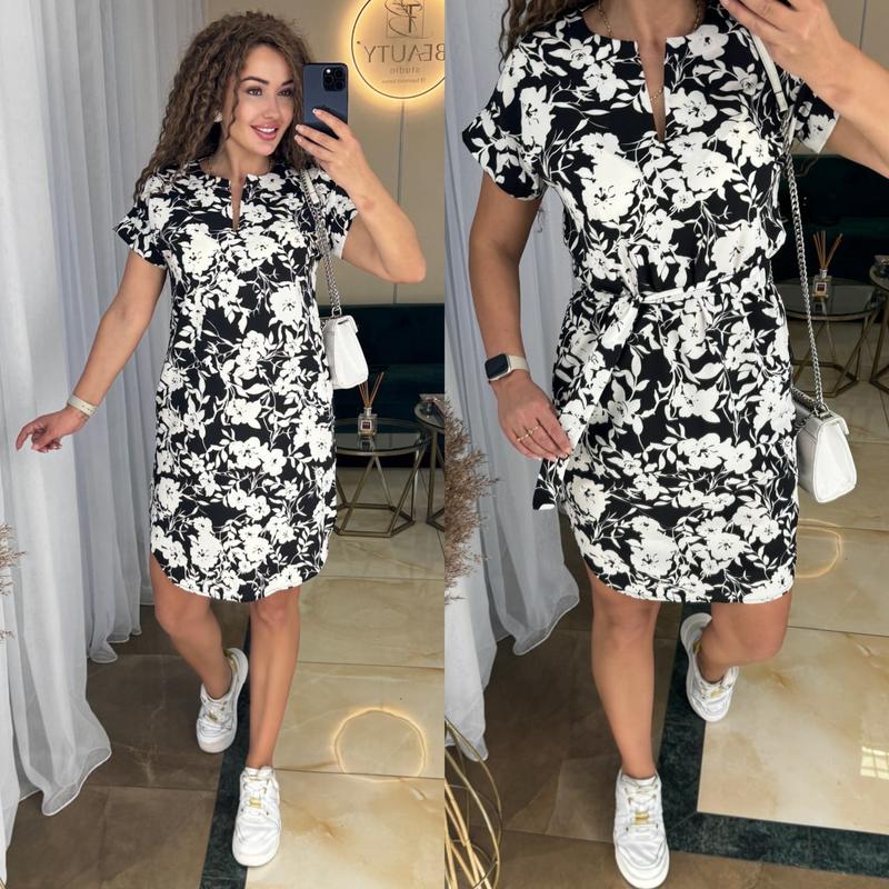 Сукня жіноча Розміри: 1(42-46) 2(46-48) 3(48-50) 4(50-52) Опис: сукня з поясом, не приталене, розрізи по боках Рекомендовані заміри: -42-46 ОГ 94 ОС 99 - 46-48 ОГ 98 ОС 103 -48-50 ОГ 102 ОС 107 -50-52 ОГ 106 ОС 111 Тканина: Софт