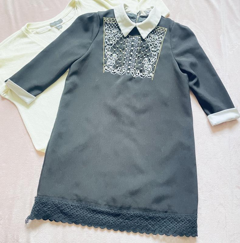 Little black dress ShowHere з білим комірцем та манжетами, по низу мереживо, в районі горловини вишитий візерунок бісером 👛 Сукня на підкладці, рукав 3/4, з одного боку внутрішньої сторони потрібно підшити комірець (видно на фото), в ціні враховано. Позаду на блискавці. Довжина - 84 Рукав - 48 НОГ - 47 НОТ - 50 НОС - 55