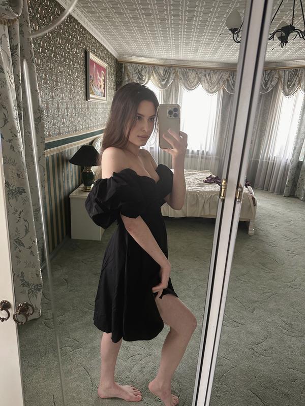 Неймовірно жіноча та спокуслива сукня у чорному кольорі. Розмір S/M. Приємна тканина. Брала на подарунок, не підійшов розмір. Від вирізу на грудях до низу сукні 66 см. Талія в застібнутому вигляді 72