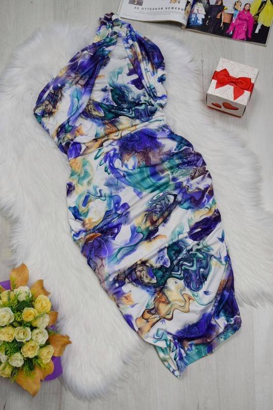 Сукня в принт на одне плече міні плаття з драпіровкою