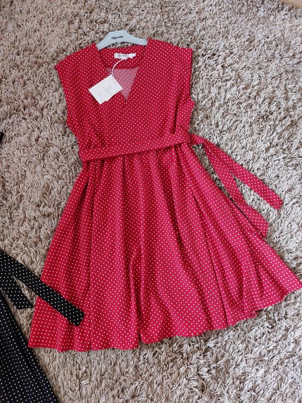 Легка невагома сукня з декольте на запах в двох кольорах червоний (колір як на фото з моделлю) і чорний в дрібний горошок. Тканина софт. Орієнтуйтесь, будь ласка, по замірах. Розмір S чорний -- продано Розмір M чорний Напівобхват по грудях 47 см Напівобхват по поясу 44 см Довжина 91 см Розмір S червоний Напівобхват по грудях 47 см Напівобхват по поясу 43 см Довжина 89 см Розмір L червоний Напівобхват по грудях 48 см Напівобхват по поясу 44 см Довжина 89 см