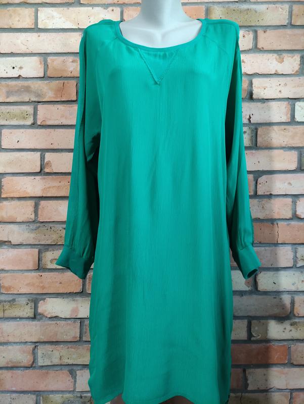Поліестер, креп, не тягнеться. Вільного крою, спинка трішки довша. Монжети рукавів трикотажні. Реальний колір сукні зелений насичений(трава). В бокових швах кармани Стан ідеальний. Розмір L довжина 82/96 ОГ 114 ОТ 110 ОС 115 плечі рукав