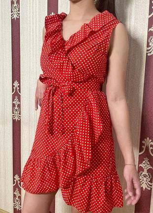 Сукня яскраво червоного кольору у білий горошок Немає слідів носки Розмір С Тканина софт На запах, що дає змогу регулювати талію З красивим декольте