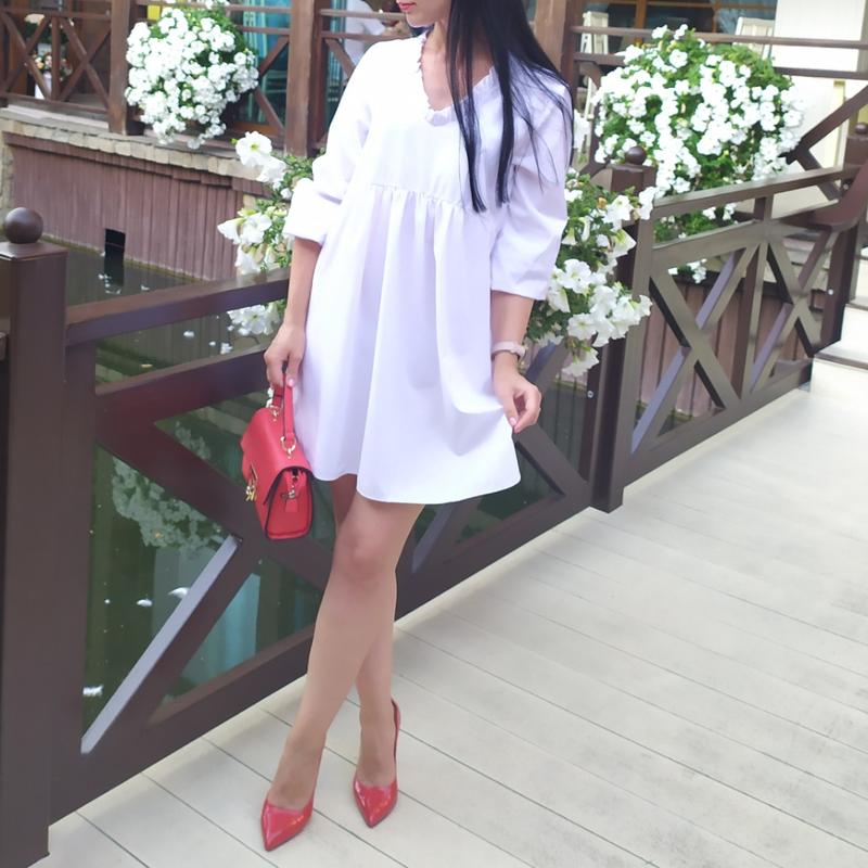 Легеньке літнє плаття вільного крою. Колір білий, тканина трішки просвічується. Можна одягати як на прогулянку так і на святкову подію. Довжина 85. Розмір 46, але одягнутий на 42