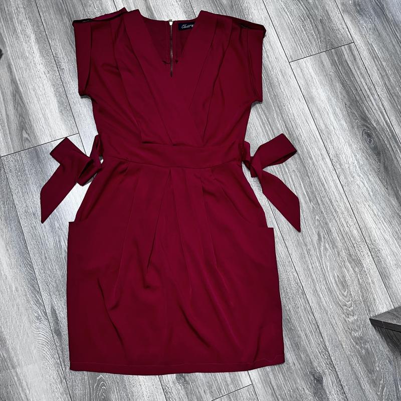 Ефектна сукня яскравого малинового кольору З карманами по боках , золотиста фурнітура Легка приємна тканина не мнеться. Довжина 90 см ОГ 44 От 38 см Об 52 см Стан ідеальний , виглядає на тілі шикарно.