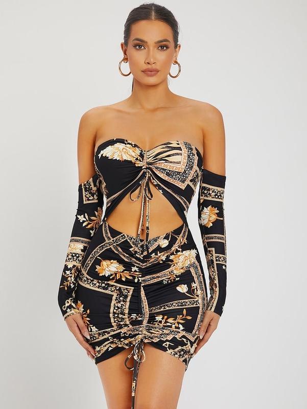 Сукня з вирізом відкриті плечі мплаття міні в принт зі стяжкою