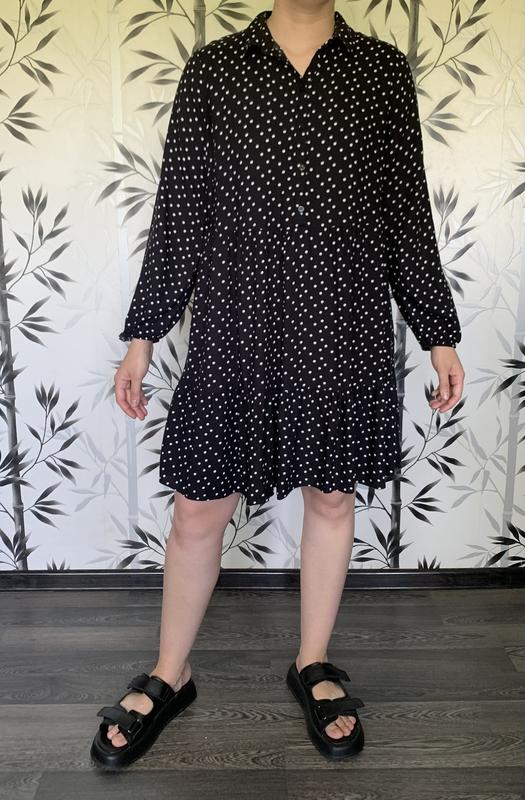 Сукня чорного кольору у білий горох Розмір Л У складі 100% віскоза Довжина 91 см, довжина рукава 59 см, напівобхват грудей 54 см Стан ідеальний
