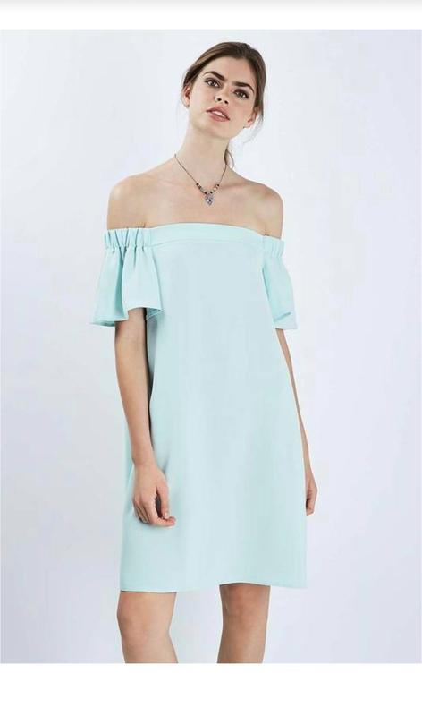Брендовое платьице с открытыми плечами мятного цвета, свободного кроя. Плечи держаться на резинках. Без дефектов и нюансов. Длина 77 Плечи тянуться от 44 до 54 ПОГ 52 ПОТ 56