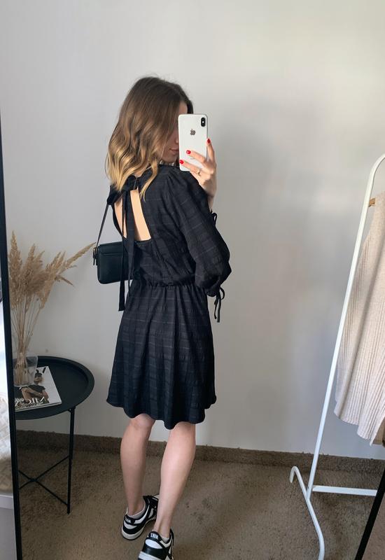 черное платье с открытой спинкой размер М длина 85 см ПОГ 48 см ПОТ 38 см (тянется, на резинке) рукав 45 см плечи 36 см стан: як нове