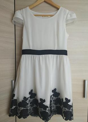 Плаття на літо, молочного кольору з чорними квітами та поясом, розмір s-m в ідеальному стані, одіте декілька разів. Торг.
