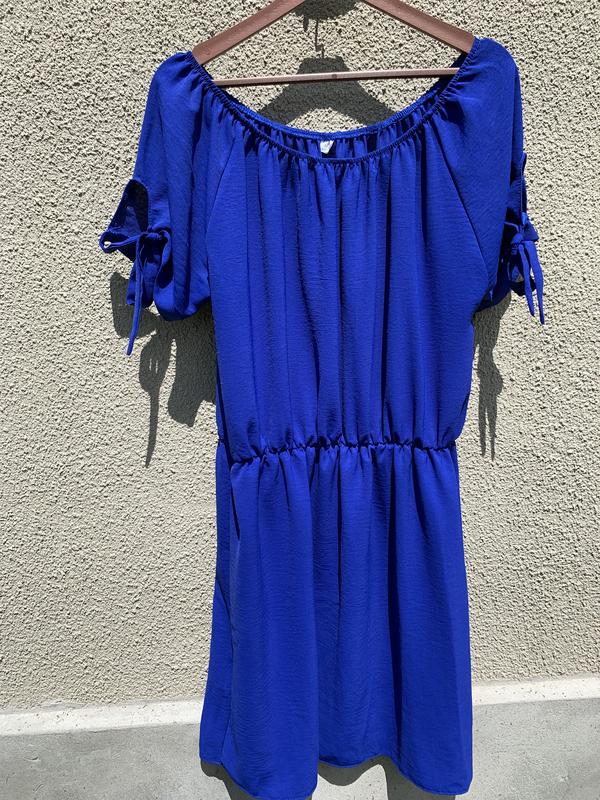 Сукня міні з резинкою на талії ,дуже красивого кольору електрик, на рукавичку завʼязка .Підійде як на розмір м так і на xl .Гарно тягнеться , хороша якість тканини .