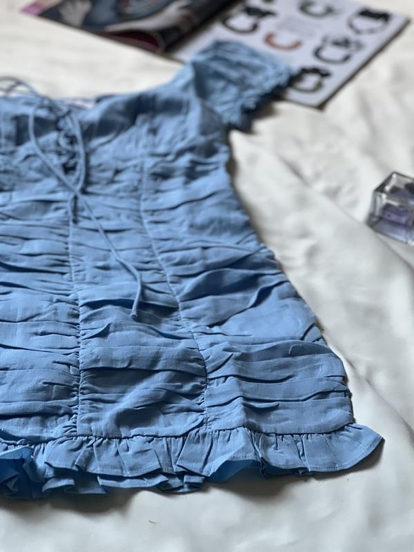 Ця сукня має V-подібний виріз із шнурівкою спереду, короткі рукави з еластичними манжетами, зібраний низ із нижньою оборкою, міні-довжину та матеріал із суміші льону. Це плаття світло-блакитного кольору. Розпродаж , така ціна поки не сезон