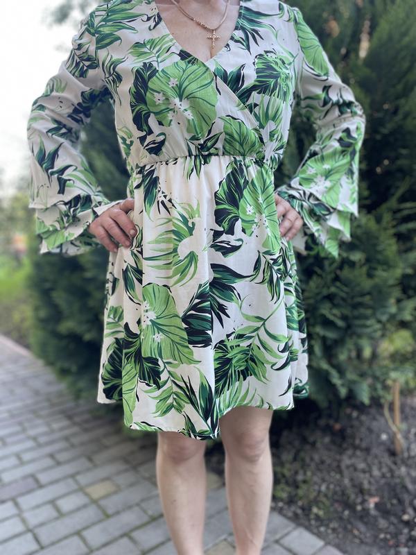 Плаття з тропічним рослинним принтом Без застібки, верх плаття на захід, рукав кльош, талія на гумці.