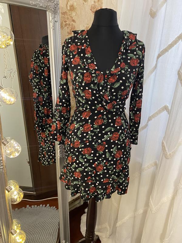 Платье от бренда Mango, длина мини. На груди и по низу платья рюши, в районе декольте находится застежка, рукав имеет длину 3/4 Размер S, но лучше всего подойдет на XS Стан - идеальный Полуобхват груди - 40 см. Полуобхват талии - 34 см. Напівобхват стегон - 45 см. Длина - 82 см. Длина рукава - 39 см.