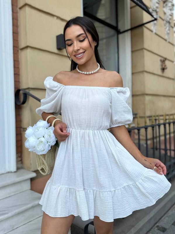 Ніжна, легка літня сукня 🌸 з пишним руковим ліхтарик; юбка прибрана на резинці з оборкою Тканина: якісний натуральний принтований "Муслін" Склад: 100% бавовна. Колір: білий, рожевий, Барбі, блакитній, лаванда Розміри: с-м (42-44); м-л(46-48) Ціна: 565 грн