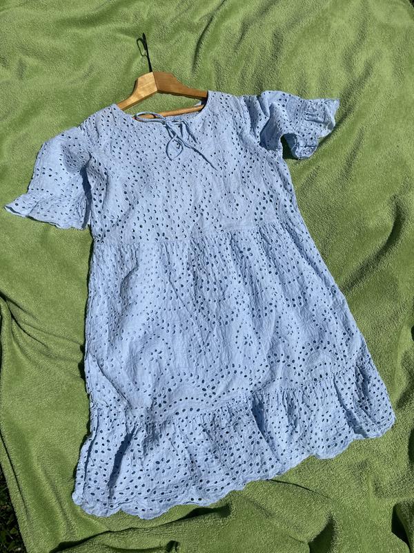 Дуже гарна сукня з прошви в ідеальному стані. Легка та практична. Колір ніжно блакитний. Загальна довжина 85см Ширина в поясі 46см Ширина під руками 48,5см Від пояса до низу по спідниці є підкладка. Може знадобитись в гардеробі майбутньої мами)