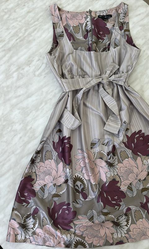 Сукня Mango із доволі цікавим ніжним принтом Дуже приємна до тіла гладка тканина Має вшиту стрічку в якості поясу, яка завʼязується позаду чи спереду Заміри: ПО талії 36 см (регулюється за рахунок поясу, що передбачено фасоном) Довжина по спинці 87 см