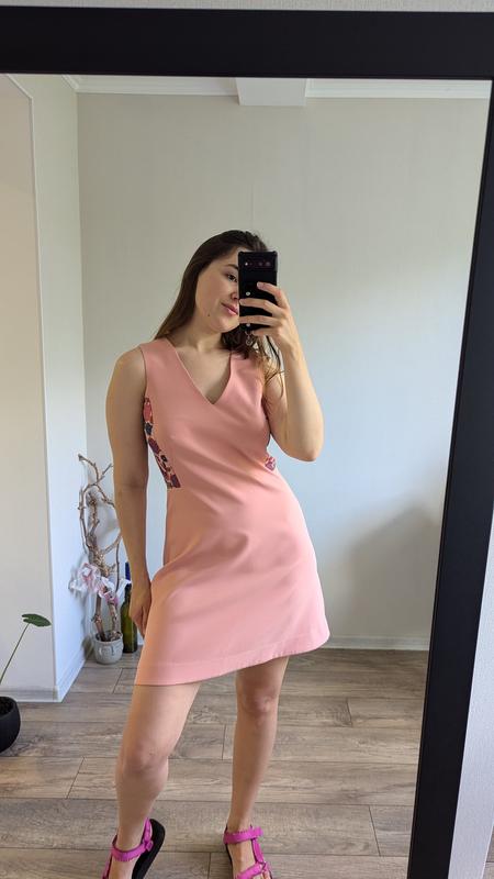 Пог 46 пот 38 пос 64 довж 87 Стильна сукня персикового кольору від бренду NENKA з цікавим принтом Розмір вказаний Л (маломірить), але вдягнуто на М (мої заміри 92-72-102) Орієнтуйтесь на заміри Тканина трошки тягнеться і тримає форму, позаду прихована блискавка