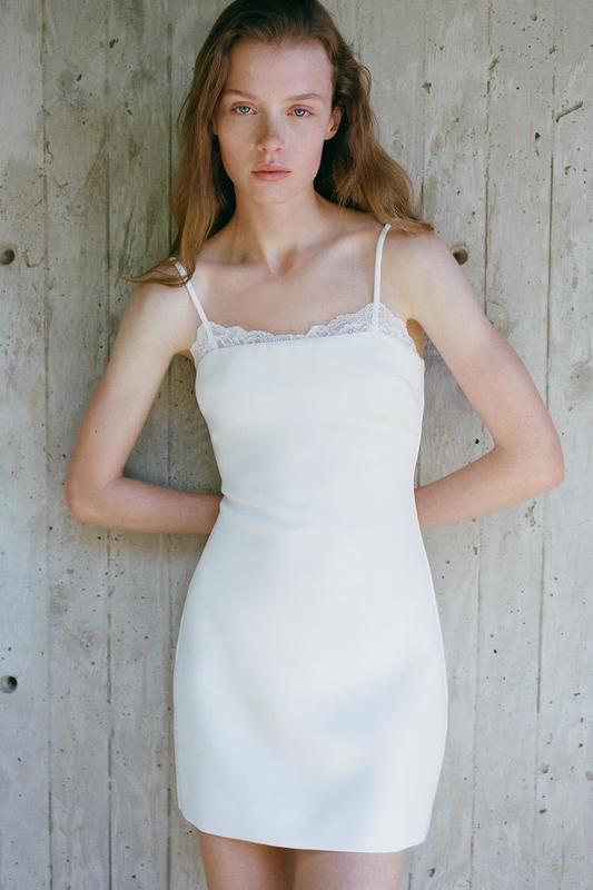 Ціна 1200 грн Коротка приталена сукня з декольте та комбінованим мереживом. Регульовані тонкі бретелі. Відповідна внутрішня підкладка. Застібка на спині з потайною блискавкою в шві. Білий | 3067/349