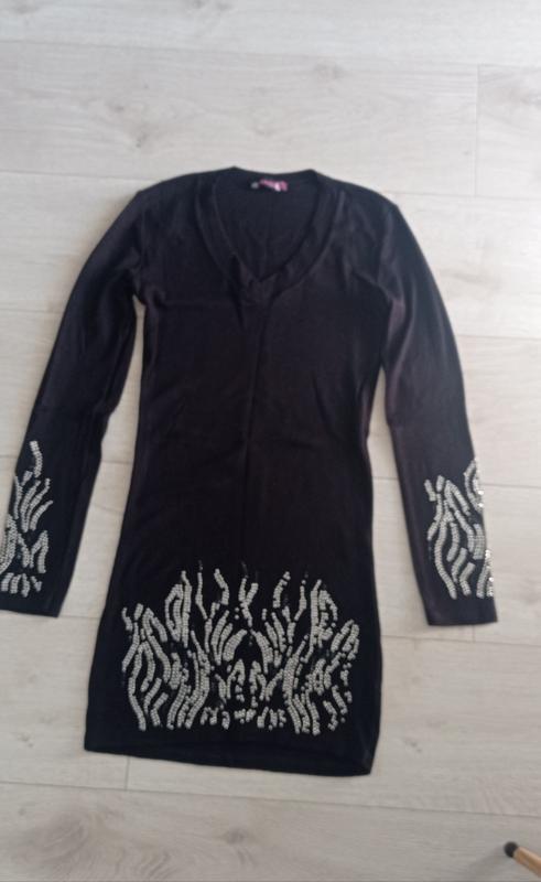 сукня чорна, коротка. з камінчиками чорними і білими. відсутні три камінчики, зовсім не помітно. довжина 78, рукав від плеча 61. пог 38, потягнеться до 50.