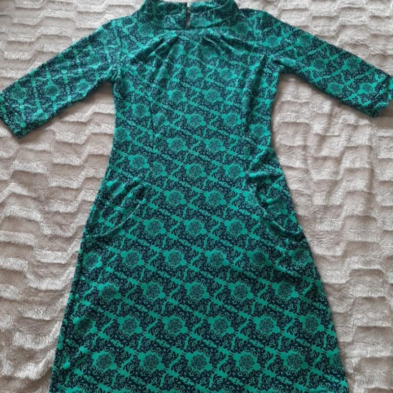 Сукня бірюзового кольору з темно-синім орнаментом, що створює контрастний візерунок. Вона має довгі рукави та приталений крій, що підкреслює фігуру. Високий комір додає сукні елегантності, роблячи її придатною як для повсякденного носіння, так і для особливих випадків. Тканина виглядає м'якою та комфортною на дотик.