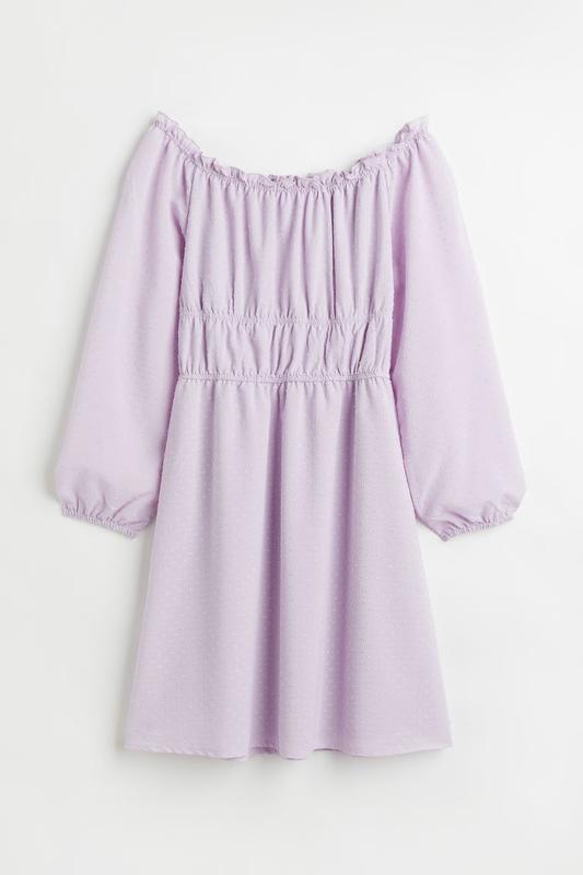 Нежное лавандовое платье 52 р Полуобхват груди в спокойном состоянии 53 см, но на груди собран, если разтянуть то полуобхват груди 58 см хотя может не максимально, платье хорошо тянется, длина рукава 55 см пол обхват в талии в спокойном состоянии 45 см, там резинка тянется до 62 см, Пол обхват бедер 68 см, длина 83см